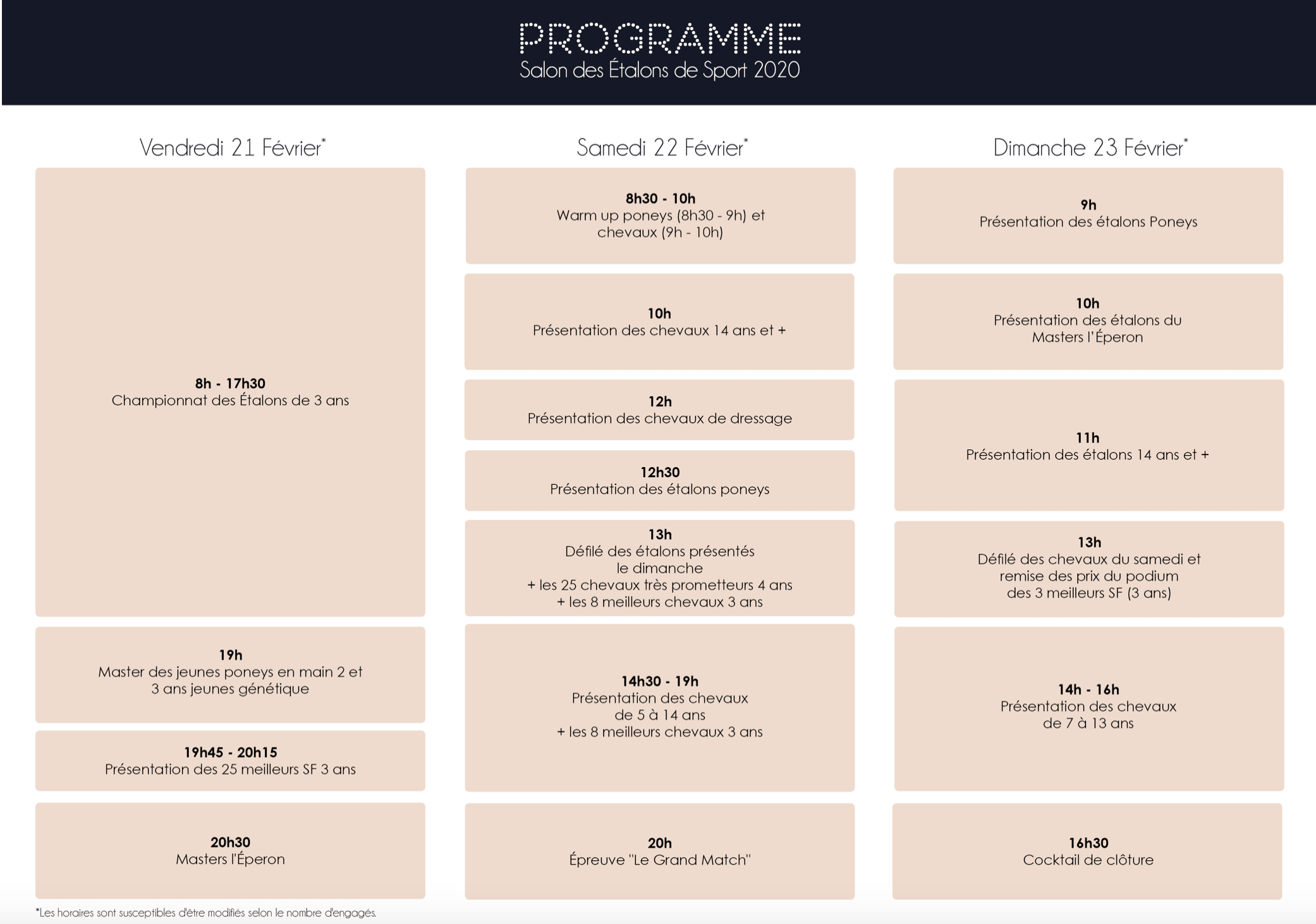 Pour la première fois, le Salon s’ouvre le vendredi, journée consacrée à la jeune génétique, avec la finale des mâles Selle Français de 3 ans, à l’issue de laquelle les nouveaux étalons seront approuvés. À partir de 19h, présentation de la jeune génétique poney (étalons de 3 et 4 ans) et des meilleurs étalons SF de 3 ans. La journée se terminera par le Master L’Éperon.